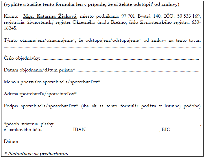 4. Pri uplatnení práva na odstúpenie od zmluvy, je kupujúci povinný informovať predávajúceho o svojom rozhodnutí odstúpiť od tejto zmluvy jednoznačným vyhlásením, a to buď listom zaslaným poštou na adresu miesta podnikania Mgr. Kataríny Žiakovej, so sídlom: Bystrá 140, 97701 Bystrá alebo e-mailom na e-mail-adresu: info@katarinaziak.sk Na tento účel je kupujúci oprávnený použiť nasledovný vzorový formulár na odstúpenie od zmluvy: