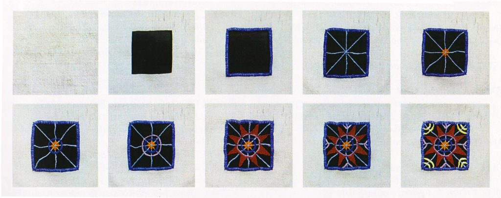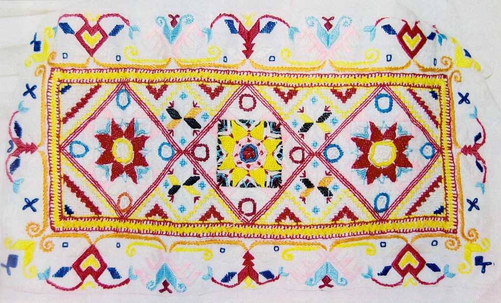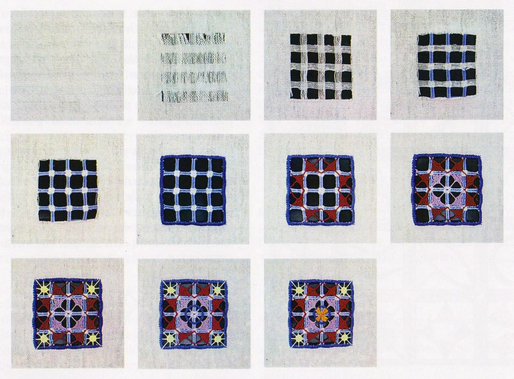 Gatra vo voľnom okienku – vyšívalo na jemný batist, či tyl do vystrihnutého výrezu, ktorý sa následne vyplnil gatrou.