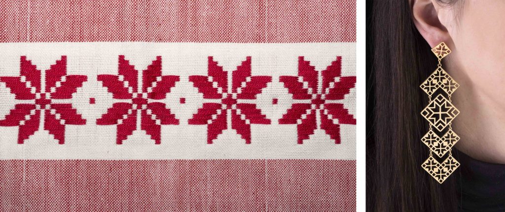 Inšpiráciou pri tvorbe kolekcie šperkov pre mňa boli geometrické vzory, ktoré som objavila na nádherných tkaných textíliách z môjho kraja Horehronia. Práve stredné Slovensko je, okrem obdivuhodných výšiviek, známe aj veľmi rozmanitými tkanými látkami s pestrofarebnými -prevažne geometrickými vzormi, ktoré nachádzame na odevných či bytových textíliách. Tento región je špecifický plstenými aj neplstenými tkaninami, ktoré vynikajú farebnými pruhovanými a ornamentálnymi vzormi „zatkanými“ priamo do tkanej látky pri je jej výrobe na krosnách. Tkanie na krosnách je tradičné remeslo, ktoré dnes vidieť už len zriedka, napriek tomu sa v dedinkách ešte stále nájdu šikovné ženy, babičky, či ich dcéry, ktoré na toto úžasné remeslo nezanevreli a venujú sa mu aj naďalej aby zachovali túto krásnu tradíciu.