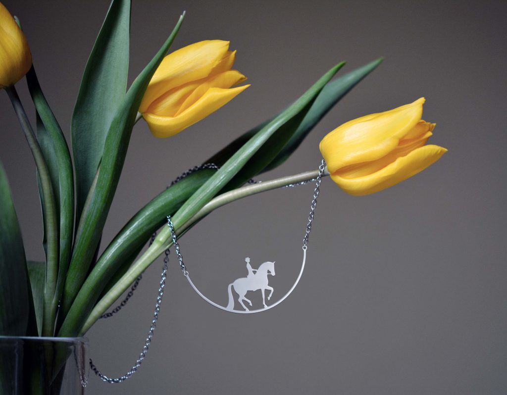 Preto nie je žiadnym prekvapením, že motív drezúrneho koňa sa objavil aj v mojich šperkoch. Prvý šperk, ktorý som vyrobila, bol práve prívesok s motívom koníka. Bol to nápad, ktorý som mala už dlhú dobu, pretože šperk úplne podľa mojich predstáv, som nikde nezohnala. Všetkým „koníkovým“ šperkom, na ktoré som natrafila, vždy niečo chýbalo. Bohužiaľ som perfekcionista a vo všetkom hľadám dokonalosť, preto som v každom prívesku s koníkom videla aj niečo, čo sa mi nepáčilo – príliš dlhé nohy, nesprávne proporcie tela, veľa trblietok atď., mohla by som pokračovať donekonečna. S hľadaním prívesku som sa nakoniec rozlúčila, už ma nebavilo, že som nenašla ani jeden, ktorý by sa mi páčil. Iróniou je, že počas celého obdobia, čo som sa aktívne venovala drezúrnemu jazdeniu, som žiadny prívesok s motívom koňa nenosila.