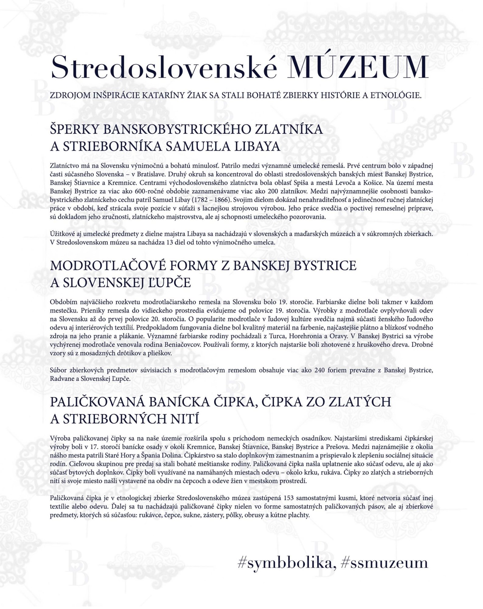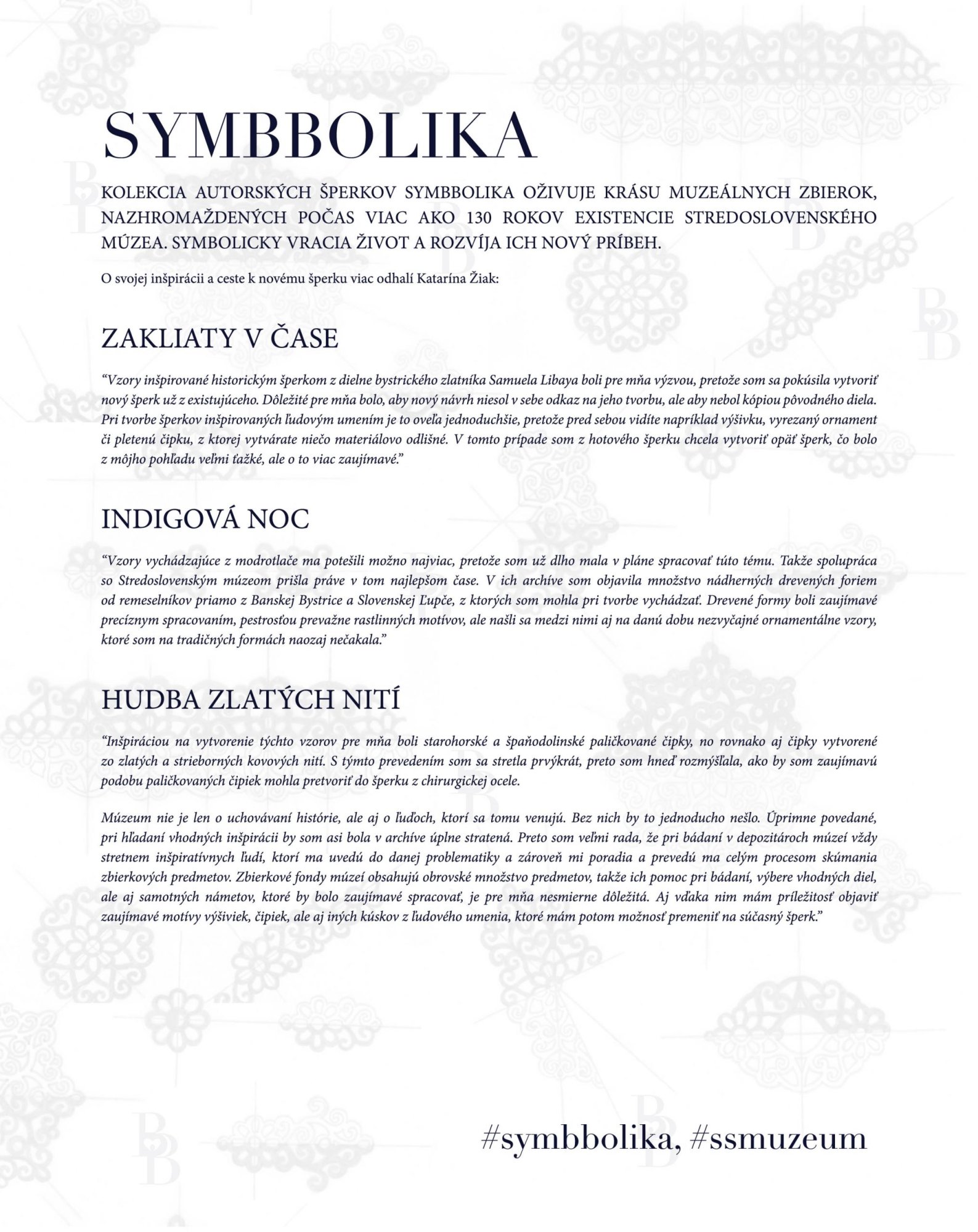 V roku 2023 som nadviazala spoluprácu Stredoslovenské múzeum pri príprave autorskej výstavy šperkov. Vybrané muzeálne zbierky sa tak mohli stať nositeľmi symboliky mesta Banská Bystrica a ľudí, ktorí v ňom tvorili a žili v dňoch dávno minulých. Výsledkom spoločného úsilia je kolekcia šperkov s názvom SYMBBOLIKA, ktorá pre budúcnosť zachová naše kultúrne dedičstvo symbolicky uložené v muzeálnych zbierkach. Súčasťou sú 3 nové kolekcie šperkov – INDIGOVÁ NOC inšpirovaná modrotlačovými formami, ZAKLIATY V ČASE historickým šperkom banskobystrického šperkára Samuela Libaya, HUDBA ZLATÝCH NITÍ – zlatou a striebornou paličkovanou čipkou zo Starých hôr a Španej doliny.
