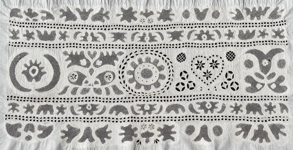 - Plná výšivka tenkou bielou niťou a jednoduchým plochým stehom. Ide o pokrytie plochy husto vedľa seba uloženými stehmi.