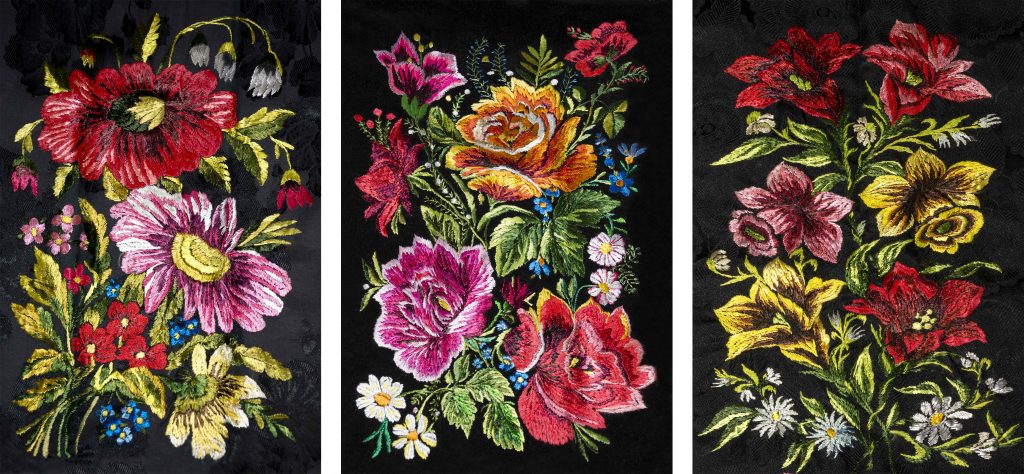 Musím sa priznať, že ma najviac upútali práve nádherné kvetinové vzory, ktoré zdobia čierne zástery. Pestrofarebné kvetinové vzory boli vyšívané na čierne „šurce“ a po okraji ich lemovali vyšité farebné vlnovky alebo pásy. Vzory kvetín boli veľmi rozmanité, časté sú ruže, maky , ľalie, margarétky… Kde brali prvé vyšívačky pri tvorbe inšpiráciu? Dnes to už povedať s úplnou istotou nevie nikto. Verím, že inšpiráciou pre nich bola, a aj stále je, krása horehronskej prírody, v ktorej žijú.